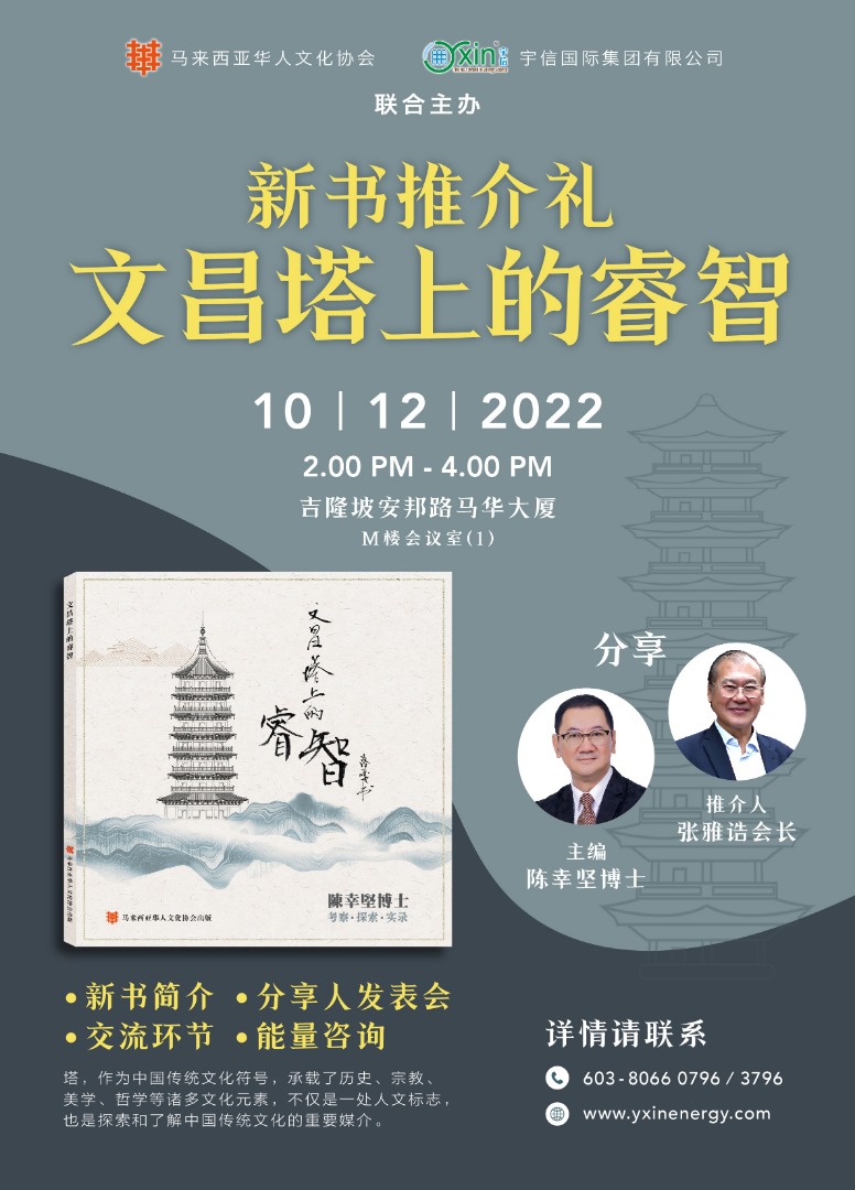 10 | 《文昌塔上的睿智》新书推介礼 日期:2022年12月10日(星期六) 时间:下午2时至4时 地点:M Floor, Meeting Room (1), Wisma MCA, Jalan Ampang, Kuala Lumpur. 详请请联系:03-80660796