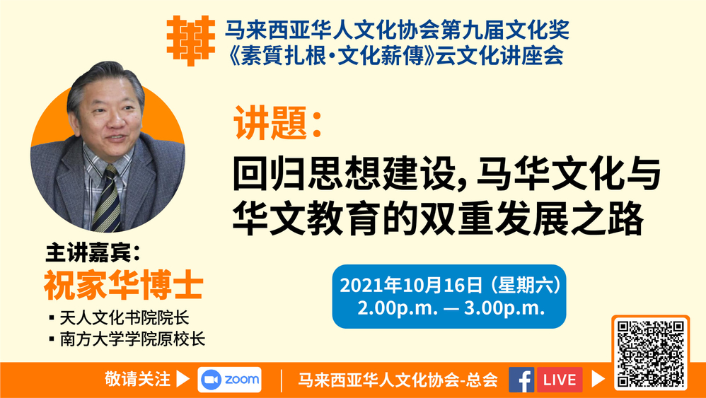 16 | 马来西亚华人文化协会第九届文化奖《扎根素质.文化薪传》云文化讲座会 日期:2021年10月16日(星期六) 时间:2.00pm-3.00pm 地点:Zoom平台、马来西亚华人文化协会总会FB Llive 讲题:马来西亚华人的回顾与展望 主讲嘉宾:祝家华博士(天人文化书院院长·南方大学学院原校长) 主持人:李娟 报名链接:forms.gle/NURGyCKj4Z8cYKsCA