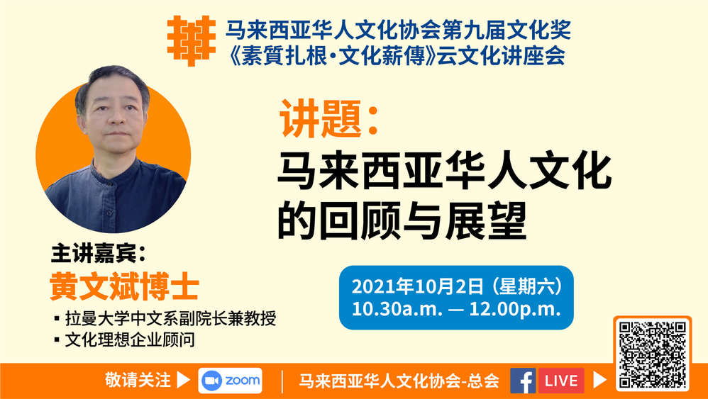 02 | 马来西亚华人文化协会第九届文化奖《素质扎根‧文化薪传》云文化讲座会 日期:2021年10月2日(星期六) 时间:10.30am-12.00pm 地点:Zoom平台、马来西亚华人文化协会总会FB Llive 讲题:马来西亚华人的回顾与展望 主讲嘉宾:黄文斌博士(拉曼大学中文系副院长兼教授) 主持人:李娟 报名链接:forms.gle/NURGyCKj4Z8cYKsCA