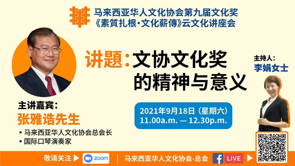 18 | 马来西亚华人文化协会第九届文化奖《素质扎根‧文化薪传》云文化讲座会 日期:2021年底月18日(星期六) 时间:11.00am-12.30pm 地点:Zoom平台、马来西亚华人文化协会总会FB Llive 讲题:文协文化奖的精神与意义 主讲嘉宾:张雅诰(马来西亚华人文化协会总会长) 主持人:李娟 报名链接:forms.gle/NURGyCKj4Z8cYKsCA