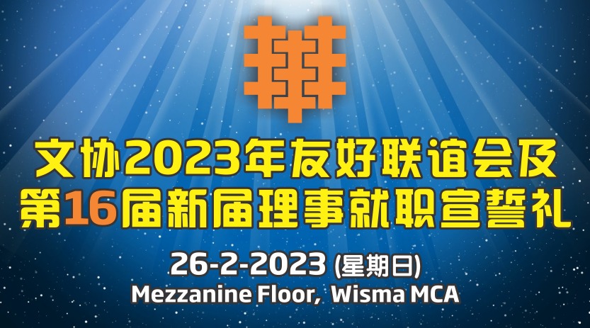 26 | 文协2023年友好联谊餐会及第16届新届理事就职宣誓礼 日期:2023年2月26日(星期日) 时间:上午11时至下午2时 地点:M Floor, Meeting Room (1), Wisma MCA, Jalan Ampang, Kuala Lumpur. 详请请联系:03-21619709 |