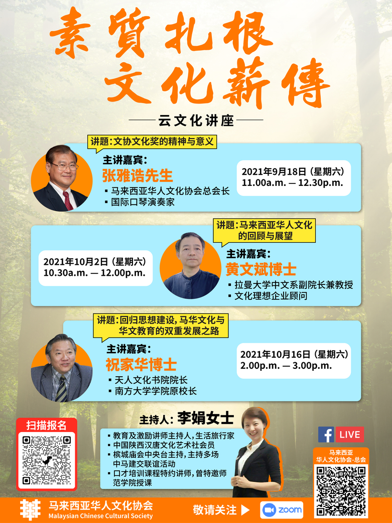 18 | 马来西亚华人文化协会9月 和10月主办3场讲座会邀线上报名 马来西亚华人文化协会定于9月和10月, 特别主办3场线上讲座会。首30名报名参加者将获赠文协出版专著一册。欲知详情,拨打文协秘书处热线电话03-21619709或发送私訊至whatsApp 0126597590。或点击所列报名链接 除外也可发送电邮至mccs2162@hotmail.com或浏览文协官方脸书:马来西亚华人文化协会-总会 线上报名,填妥报名资料,秘书处随后通知讲座链接密码。 线上3场专题讲座乃为配合文化协会3年一度举行的文协《文化奖》品牌系列项目,文化奖主办迄今已进入第九届,颁奖礼将于11月13日线上举行。 文化奖工委会特别邀请我国著名学者及资深文化专才为主讲人,因为疫情肆虐,以别开生面的方式,通过ZOOM视频开唛,按文化奖《素质扎根.文化薪传》主题,与广大民众及学生在交流平台上分享大会特定设计的专题。 文协总秘书祝金梅指出,为传承,传播或传颂先贤祖辈落地生根流传下来的中华文化 ,随着时代变迁而演进,根深蒂固的守着之余同时也就这基础上延续开创前进,这是文协推动会务的任务也是方向。她说:参加者除可获得文协出版的专著 , 同时也将受邀出席11月13日的文化奖线上颁奖礼观礼嘉宾 。 工委会讲座组主任李凌篆在文告报道,首场讲座会订于9月18日(星期六) 上午11时至中午 12时30分 举行 ,由文化协会总会长张雅诰主讲,讲题:《文协文化奖的精神与意义 》,线上分享文协《文化奖》设立的意义与精神内涵 ,也倾谈文协的心路历程以及文化艺术界前辈对华人文化产业的塑造、贡献及深远影响等等话题。 第2场讲座订10月 2日(星期六) 早上10時30分至中午12 時举行,邀请拉曼大学中华研究院副院长黃文斌副敎授主讲,讲题: 《马来西亚华人文化的回顧与展望 》。黄文斌博士任职中华研究中心主任 ,其学术研究专长于儒道佛思想的在地化发展与影响、钱穆及近现代思想人物的思想研究 、马来西亚华人文化及社会研究 。 黄文斌博士为新一代资深华文教育及学术研究学者代表之一, 热爱中华文化, 尤其是在地华人文化产业个案的发掘、研究及著书立文,并热衷于推动文化活动,为时下新一代社会宣扬和宣导华人文化产业的研究成果和传承 。 第3讲订于10月16日 ( 星期六)下午2時至3時举行,邀请天人文化學院院長也是南方大學學院原校長祝家华博士主讲,讲题:《 回归思想建设: 马华文化与华文教育的双重发展之路》, 内容扼要概括 回归思想建设: 马华文化与华文教育的双重发展之路 。祝家华博士将带领听众走入大马政经结构下的马华文教双重发展之路、华文教育(华教)二百年历程与马华文化的濫觞等话题与大家分享。 三场讲座会主持人李娟女士,乃我国著名文化活动主播;中国陕西汉唐文化艺术社成员,热爱文化旅游也是生活旅行家,活跃于主持教育培训等活动。 云端讲座不“疫”样,工委会吁请大众踊跃报名,齐聚云端。