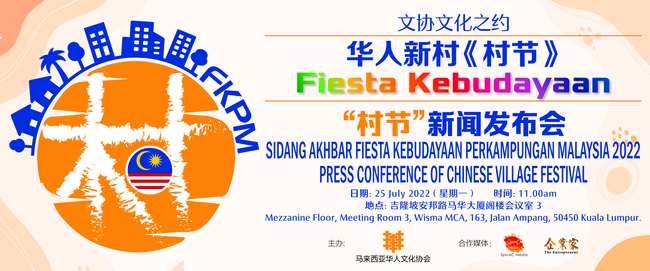 25 | 文协文化之约华人新村《村节》新闻发布会 日期:2022年7月25日(星期一) 时间:早上11时 地点:吉隆坡安邦路马华大厦阁楼会议室3 (Mezzanine Floor, Meeting Room 3, Wisma MCA, 163, Jln Ampang, 50450 KL.) 主持嘉宾:文协总会长张雅诰,文协总秘书兼文协文化之约《村节》总策划祝金梅 特邀嘉宾:马华总秘书拿督张盛闻