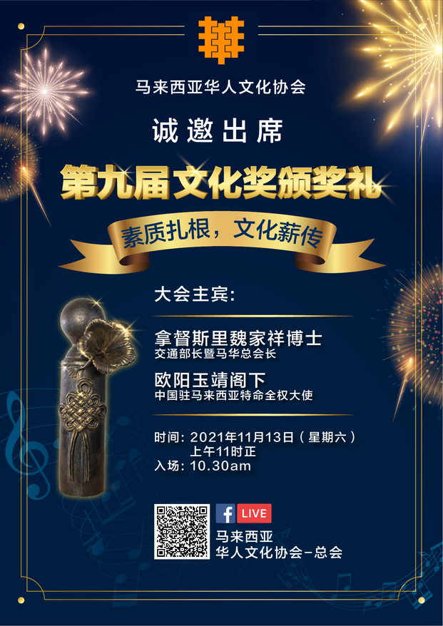 13 | 第九届马来西亚华人文化协会《文化奖》-《扎根素质.文化薪传》颁奖礼线上举行 日期: 11月13日(星期六) 时间:上午11时 地点:ZOOM 会议室